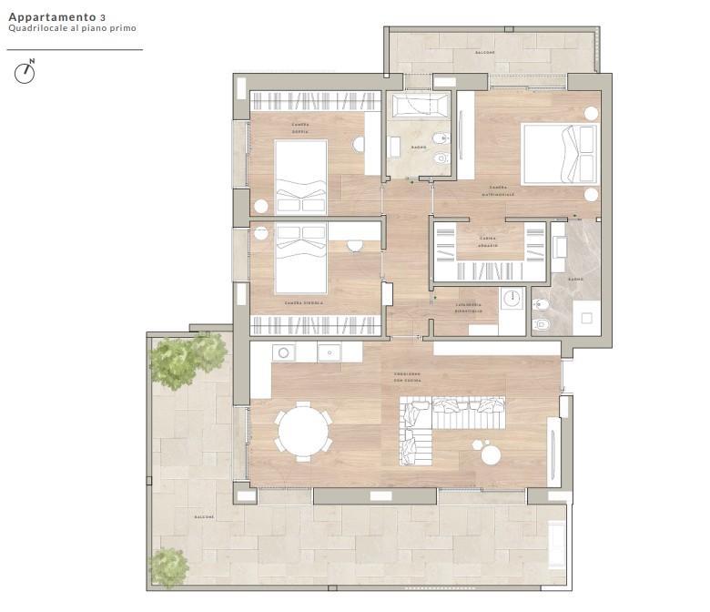 3 - L’appartamento è situato al piano primo ed abbracciato, per tutta la zona giorno, da un piacevole terrazzo loggiato. Entrando, si presenta il soggiorno che ci accoglie con le sue importanti finestrature che permettono allo spazio interno di rimanere sempre in contatto visivo con il verde esterno, in una continua simbiosi di luce e natura che caratterizza questa soluzione; la cucina, è impreziosita da un’ampia vetrata. Dal disimpegno si accede alla lavanderia, al bagno e alle tre camere da letto, di cui due sono singole grandi ed una è la camera master. Nella zona master, oltre alla zona notte, è prevista una cabina armadio ed un bagno en suite. Visita il nostro sito: www.dimoramauri.it
