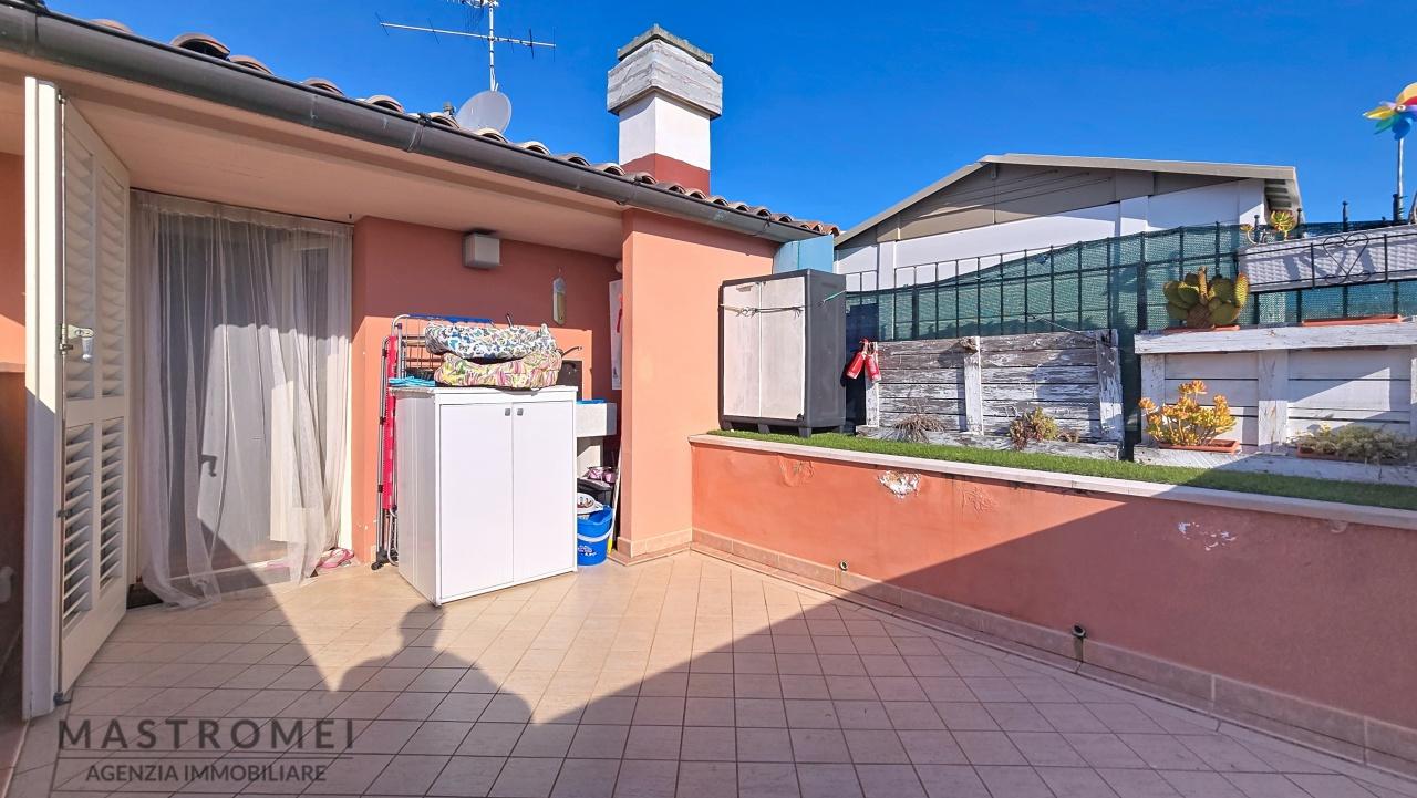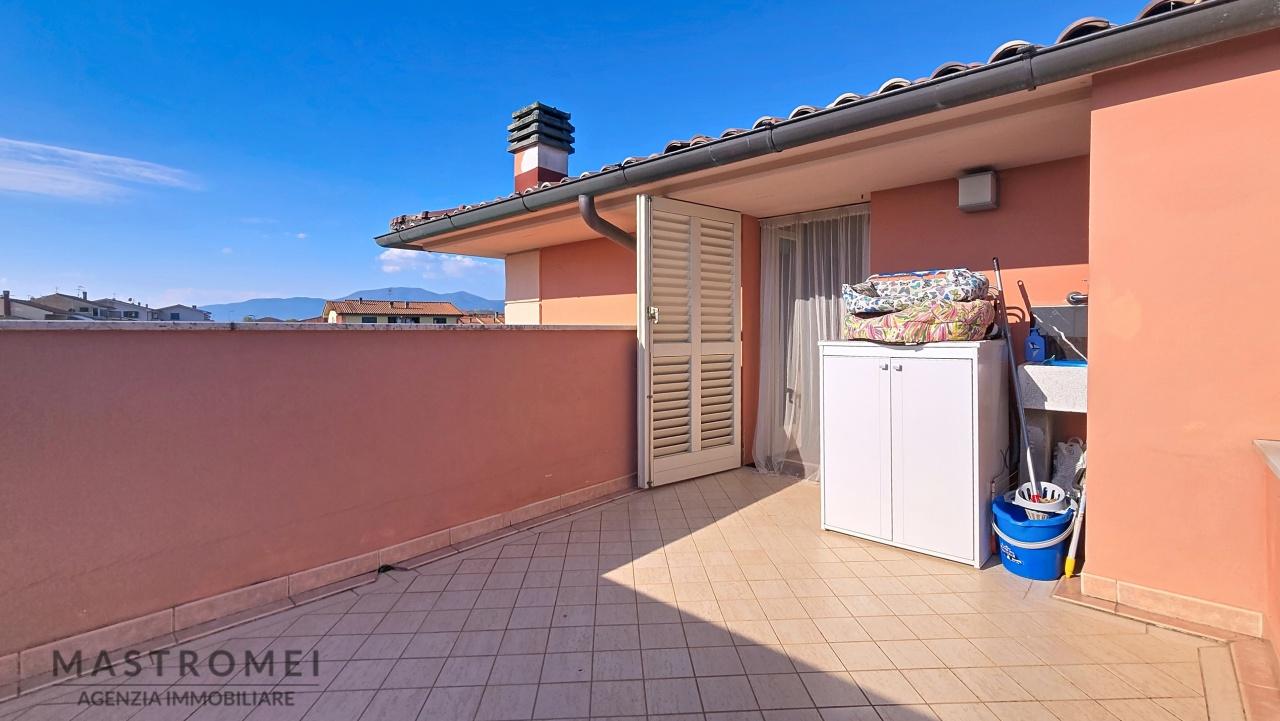 Posta a due passi dal centro del paese di Altopascio questa villetta a schiera centrale presenta caratteristiche interessanti avendo disponibilità sia di uno spazio esterno vivibile per cene all´aperto in estate che come area relax. La villetta è così composto al suo interno da: ingresso su zona giorno con cucina a vista e pratico ripostiglio sotto scala, dalle belle scale in pietra lavorata si accede al primo piano dove troviamo una camera da letto matrimoniale di buone dimensioni che ha accesso ad un balcone, oltre un bagno finestrato con doccia, quest´ultimo riammodernato di recente. Sempre attraverso scala in pietra si accede al secondo e ultimo piano mansardato dove troviamo due vani di cui uso bagno e un´ulteriore camera da letto matrimoniale, provvista di cabina armadio. Attraverso la camera si accede ad un ampio terrazzo di circa 15mq e sempre dallo steso piano si accede al secondo terrazzo a tasca sempre di circa 15mq, entrambe abitabili con affaccio verso la città. Gli infissi sono in legno con doppio vetro, come anche le persiane e rifiniture di ottima qualità. Sono presenti tutti gli allacci ai sottoservizi quali metano, acqua e fognature pubbliche e fibra., Possibilità di solare termico. Completa la proprietà un comodo garage di circa 15mq . - SC9480414